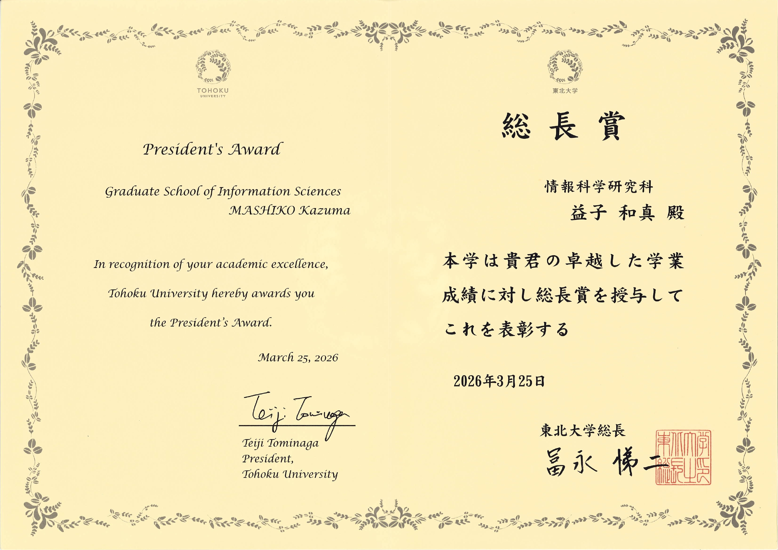The graduation ceremony of Tohoku University was held on Mar. 25, 2026. Kazuma Mashiko (M2) was awarded the President’s Award of Tohoku University, and Reham Wafaee Ibrahim (D3) was awarded the Dean Award of the Graduate School of Information Sciences (GSIS) of Tohoku University. These awards are selected from 150 students of the GSIS doctor and master courses. The President’s Award is given to 2 students and the Dean Award is given to 4 students.